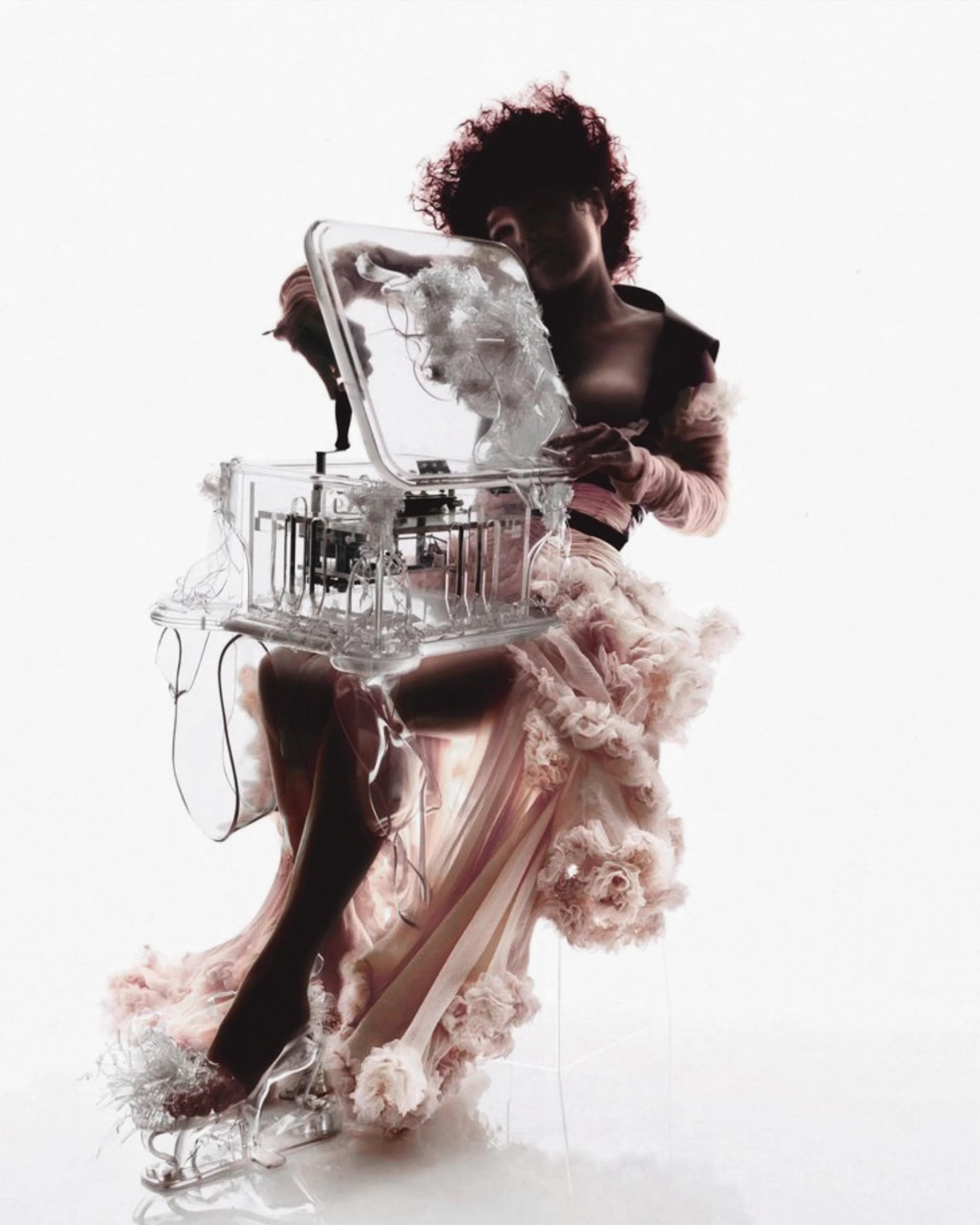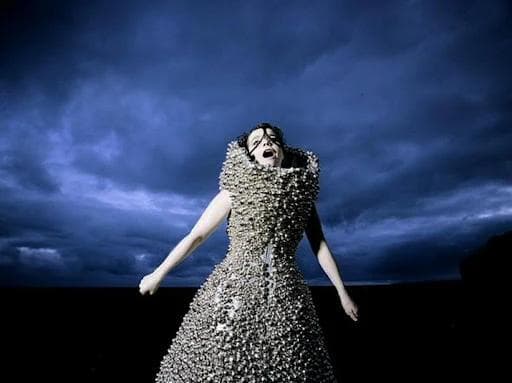 In the mid-1990s, two rising icons; Icelandic singer Björk Guðmundsdóttir and British designer Lee Alexander McQueen found in each other a kindred creative spirit. They were introduced not through a formal meeting, but through art itself: Björk was struck by an arresting image in a 1997 issue of Visionaire magazine (guest-edited by Rei Kawakubo). The photograph by Nick Knight featured model Devon Aoki in a fantastical McQueen creation – an eerie tableau of cold beauty, with cherry blossoms spilling from a forehead wound. Björk later recalled how something in that image “chimed” with the ideas brewing for her next album. She reached out to McQueen directly, sensing a sympathetic vision. “She rang me up,” McQueen remembered, “and she explained what the album was feeling”. Thus began a collaboration – and a friendship – built on mutual fascination with the avant-garde. Both were unafraid of the strange or the surreal; both saw fashion and music as two halves of a whole, capable of weaving new worlds when united.