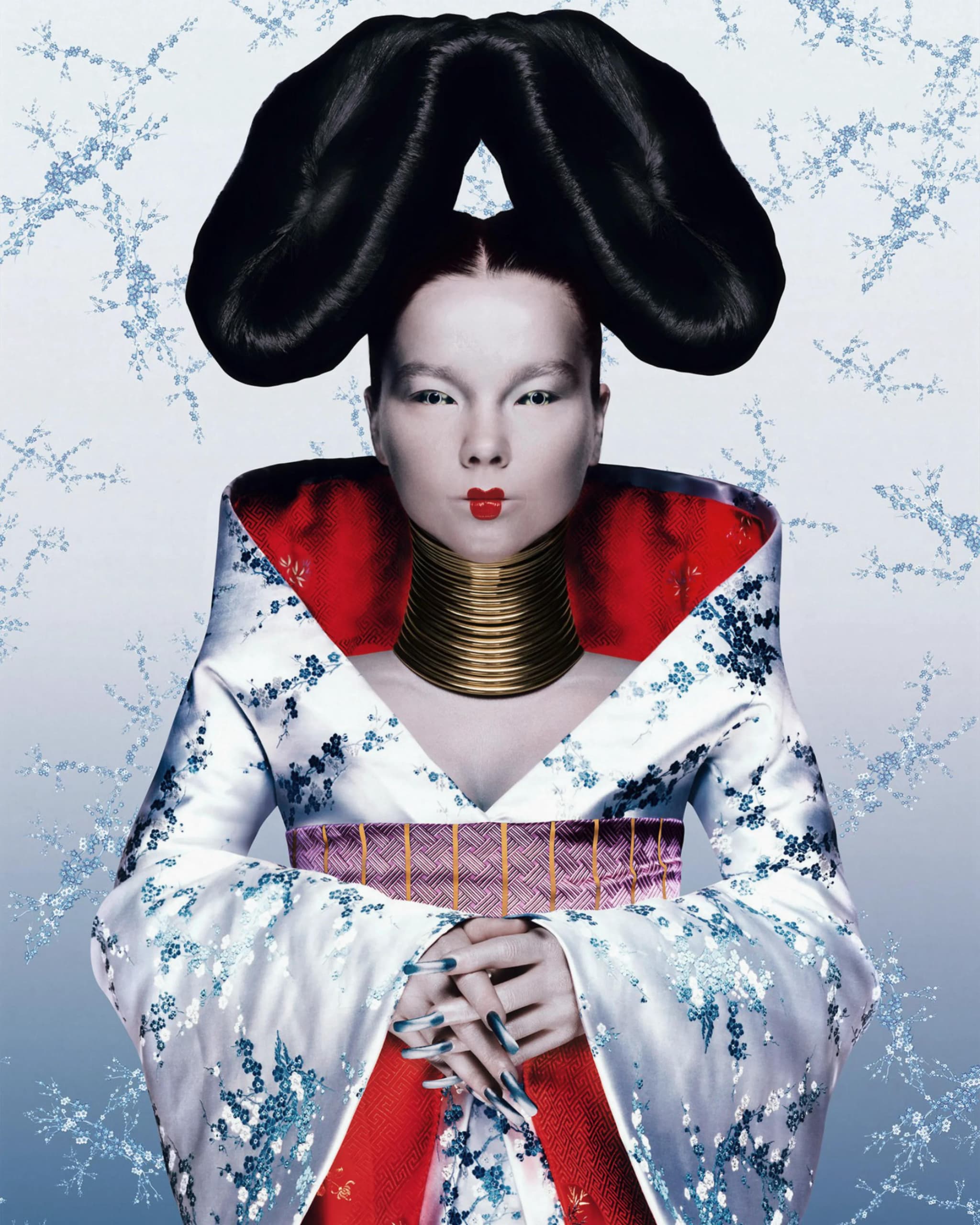 The first major collaboration between Björk and McQueen was for Homogenic, where McQueen designed the now-iconic kimono-inspired gown for the album cover. The dress, made of silk damask with floral embroidery, became synonymous with Björk's bold, avant-garde persona. Styled by McQueen and photographed by Nick Knight, the imagery portrayed Björk as a fierce, mythical figure. Her hair, sculpted into two enormous buns and her posture rigid, mirrored the strength of her music, which blended orchestral and electronic elements. The gown's mix of traditional and futuristic elements – from the kimono silhouette to the artificial nails – embodied the album's blend of ancient and modern influences.